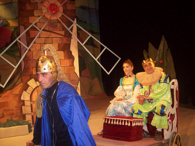 Այնքան կառուցիկ ու հետաքրքիր է Թագավորի մուտքը, որ անմիջապես մտածում ես՝ վերջ, նրա կերպարն ավարտված է առանց զարգացման հեռանկարի: Բայց դերակատար Շահեն Հարությունյանն այն դերասանը չէ, որ անակնկալներ չմատուցի: Յուրաքանչյուր նոր մուտքի ժամանակ նա ներկայացնում է թագավորի նոր հոգեվիճակ, բացահայտում նրա բնավորության գծերը: Միամի՞տ է Թագավորը, անճարա՞կ, վախկո՞տ, դյուրահավա՞տ… Այո: Բայց նաև ազնիվ է, մարդասեր, կամեցող… Հեղինակը, նաև դերակատարը նրան չեն վերաբերվում սարկազմով: Այստեղ գործում է միայն գրական հեգնանքը: Այսպիսին է Թագավորը, ու բարի եղեք նրան ընդունել այնպիսին, ինչպիսին կա: Ոչ մի կեղծիք: Բայց դերասանը Թագավորի կերպարն ավելի իմաստավորելու համար գնում է հետաքրքիր քայլի՝ ինքն է քաշում կառք-սայլակը, երբ հոգնած զինվորը պառկած է նրա մեջ: Այնպես որ, պետք է հրաժարվել կարծրատիպից. բոլոր արքաները չէ, որ միայն հրամայել գիտեն: Շ. Հարությունյանի մարմնավորած Թագավորը նաև սիրասուն հայր է, ով ոչինչ չի խնայում իր դստեր և նրա սիրեցյալի երջանկության համար: Ամբողջ ներկայացման ընթացքում Շ. Հարությունյանն իր նախասիրած կատակերգական տարերքի մեջ է: Նրա յուրաքանչյուր խոսքը, դիմախաղը, շարժումը տրամաբանված են, հստակ ու ճշգրիտ՝ ենթարկված ներկայացման ընդհանուր գեղագիտությանը: